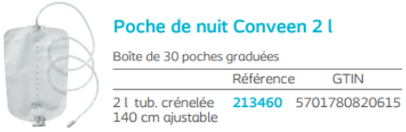 Le système collecteur conveen : pour les fuites urinaires masculines se compose d’un étui pénien et d’une poche de recueil des urines. Afin de s’adapter à chaque morphologie et degré de sévérité de l’incontinence, nous proposons un large choix d’étuis (longueur et diamètre) et de contenance de poches (250 ml à 2 L).